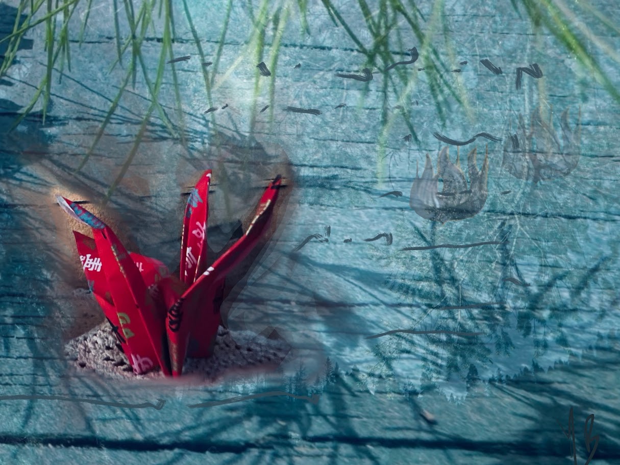 2024. I created this image combining photographs from a wedding celebration and a b' mitzvah. An origami crane and an eternal flame adrift on a sea of blue.