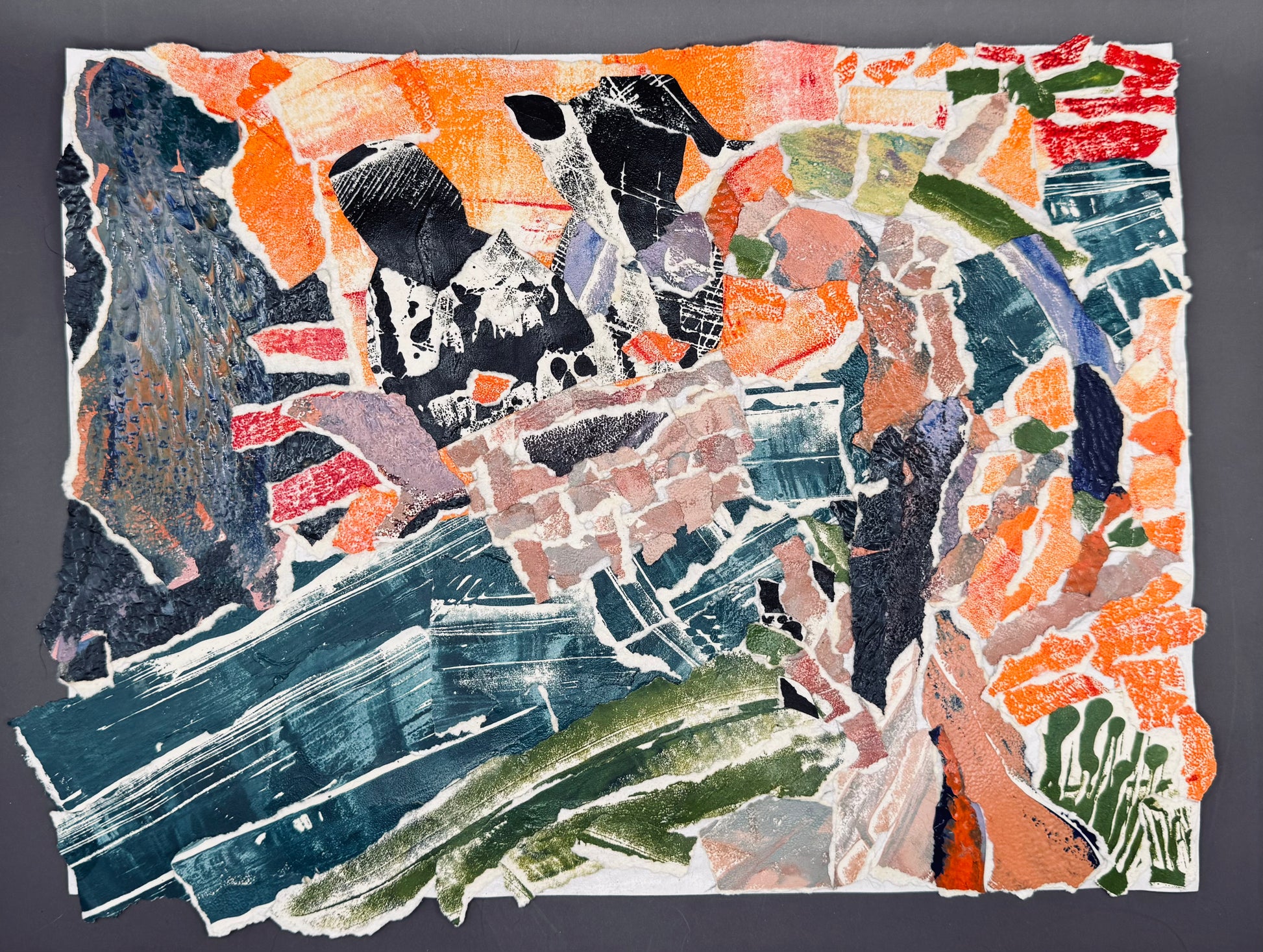 2021 & 2025. I experimented with mono printing brush strokes, then used the painted papers to create this collage. It depicts a scene at a river. On one side, two figures representing Jochebad and Batya, pass a baby in a basket, and a third figure, Miriam, keeps watch. On the other bank, a tree of life grows into a rainbow.