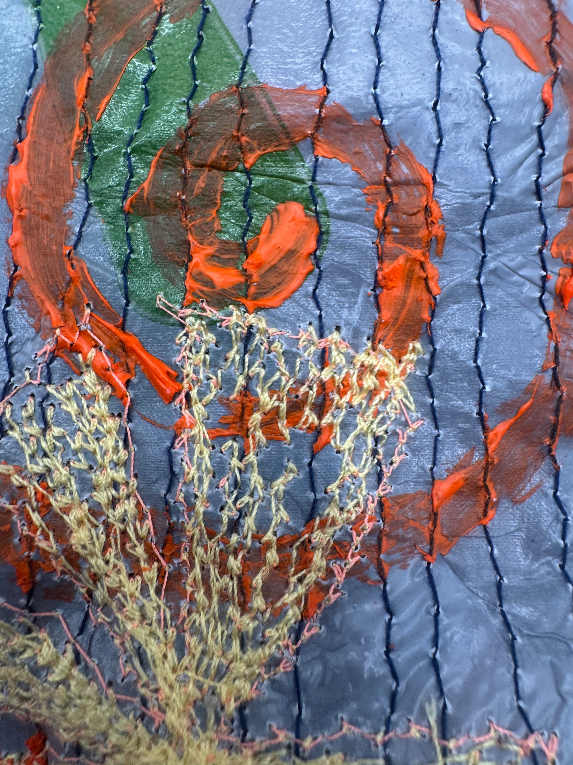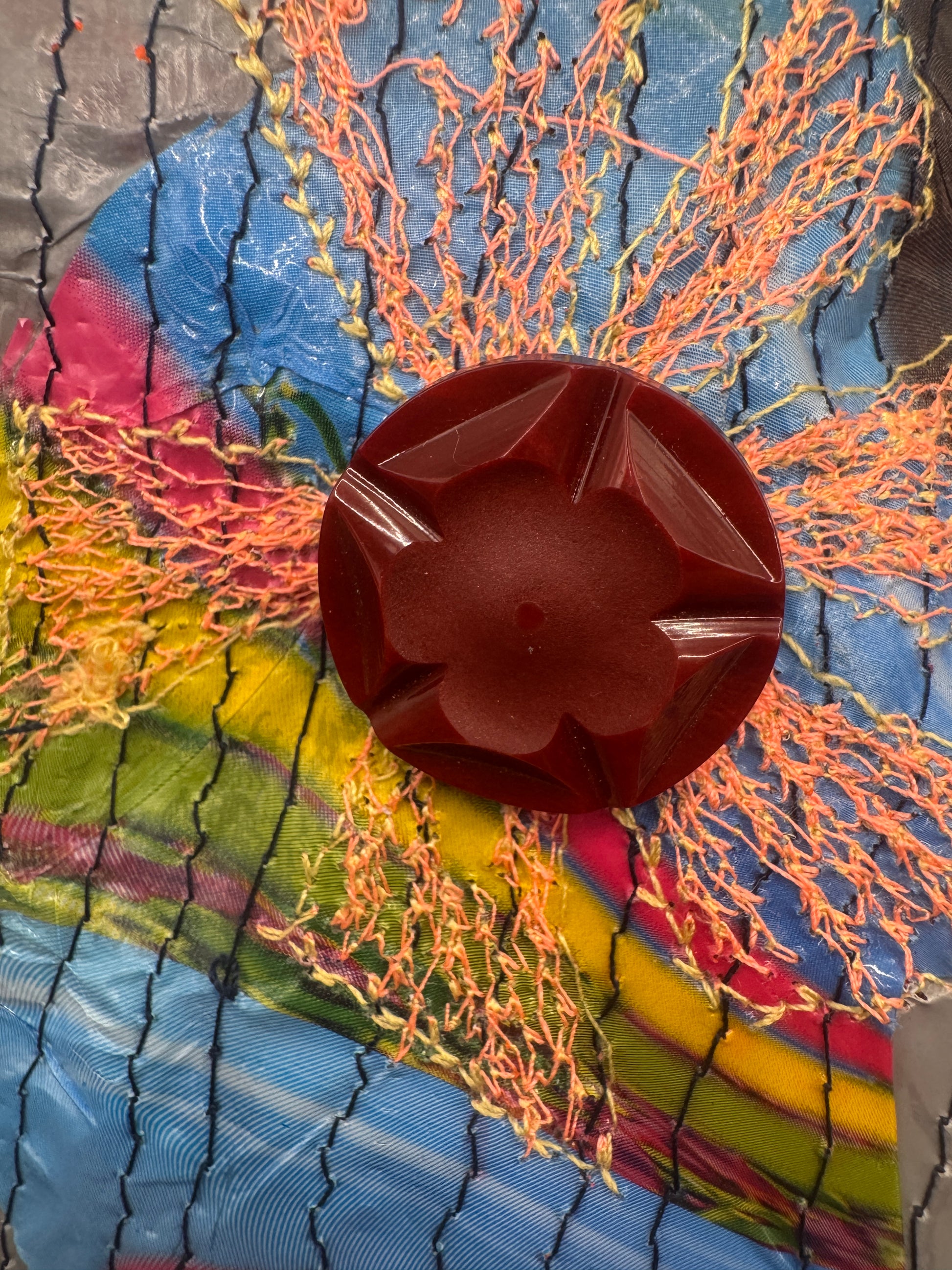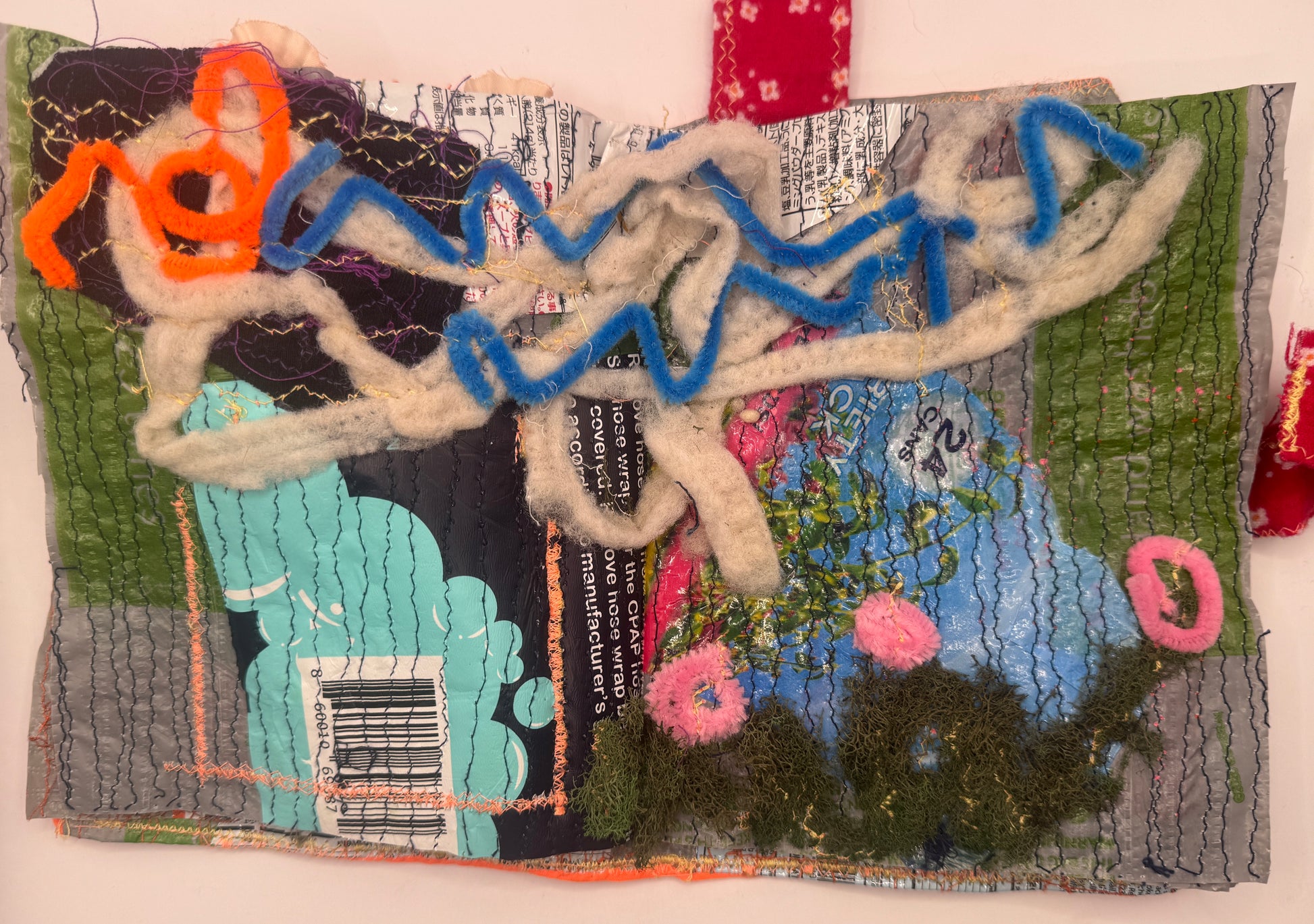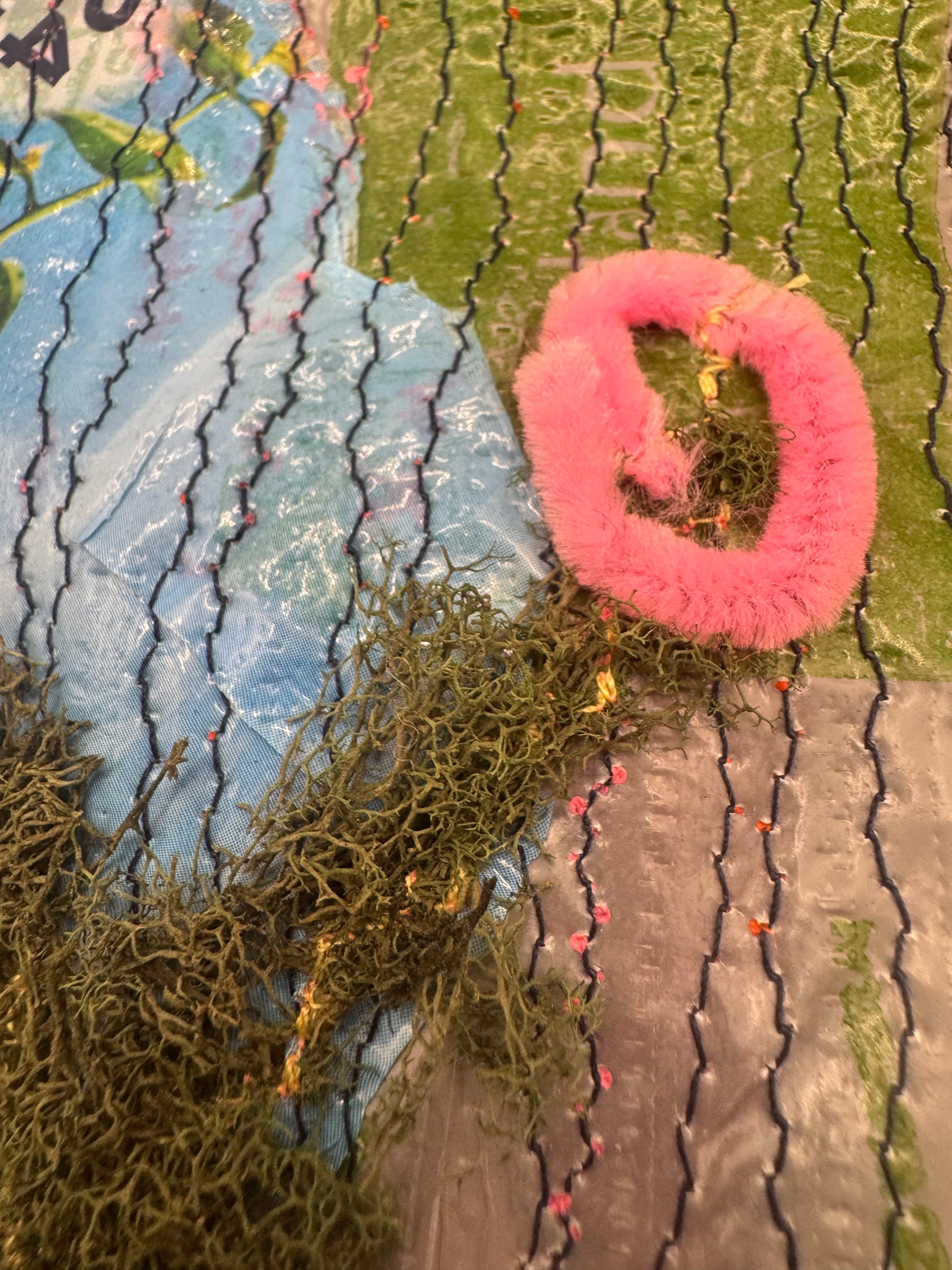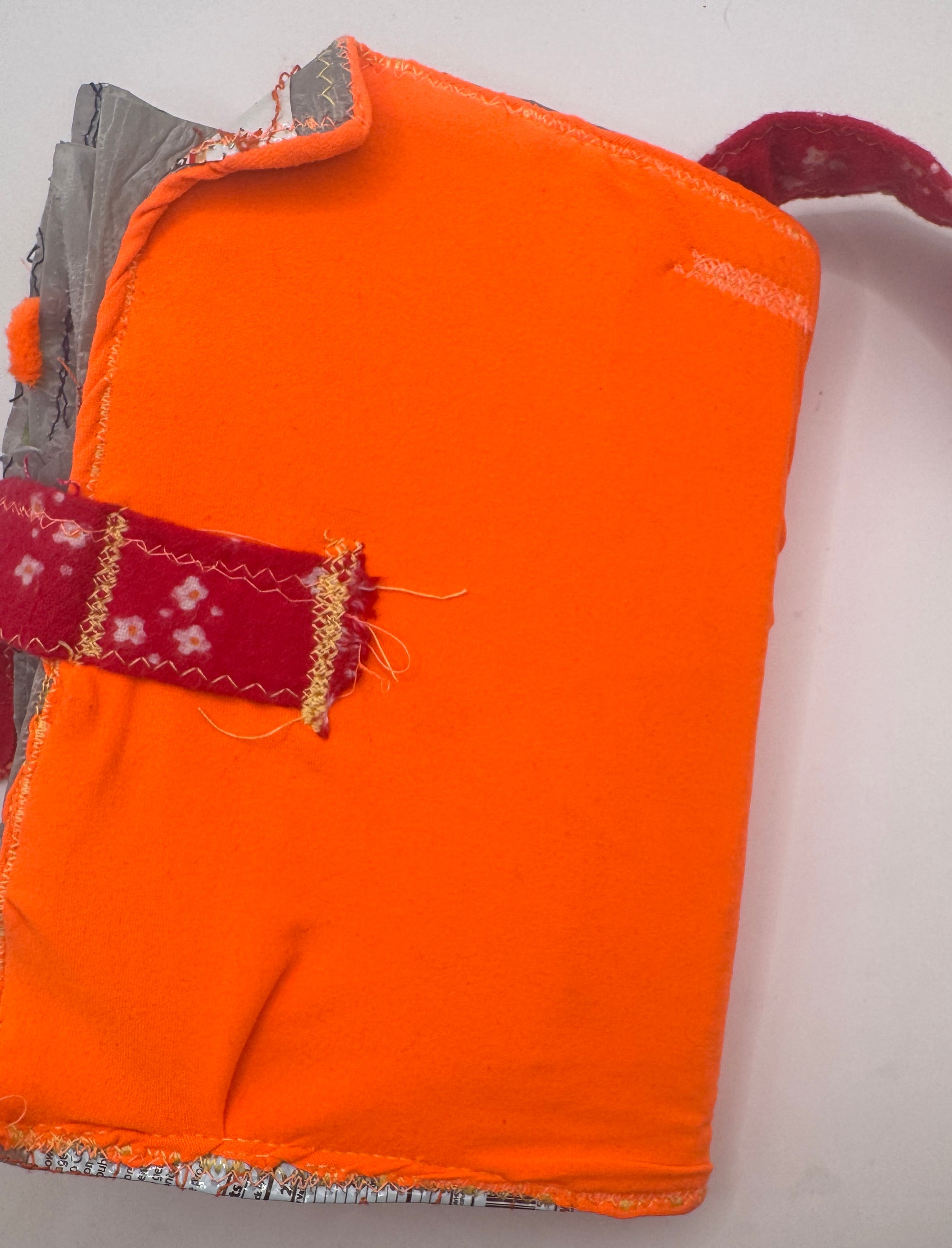 This series of busy books has allowed me to act on this dream while unAble to work at that scale. The books turn waste into fashion, offering interactive sensations and textures for the collector to explore. Busy Book Volume 3, the Flower Edition, was created during a period of prolonged illness, when I had to adapt my creative process to account for intense light sensitivity. The paths created by the stitching became my early morning meditation, and show stitch-by-stitch my journey through this pain.