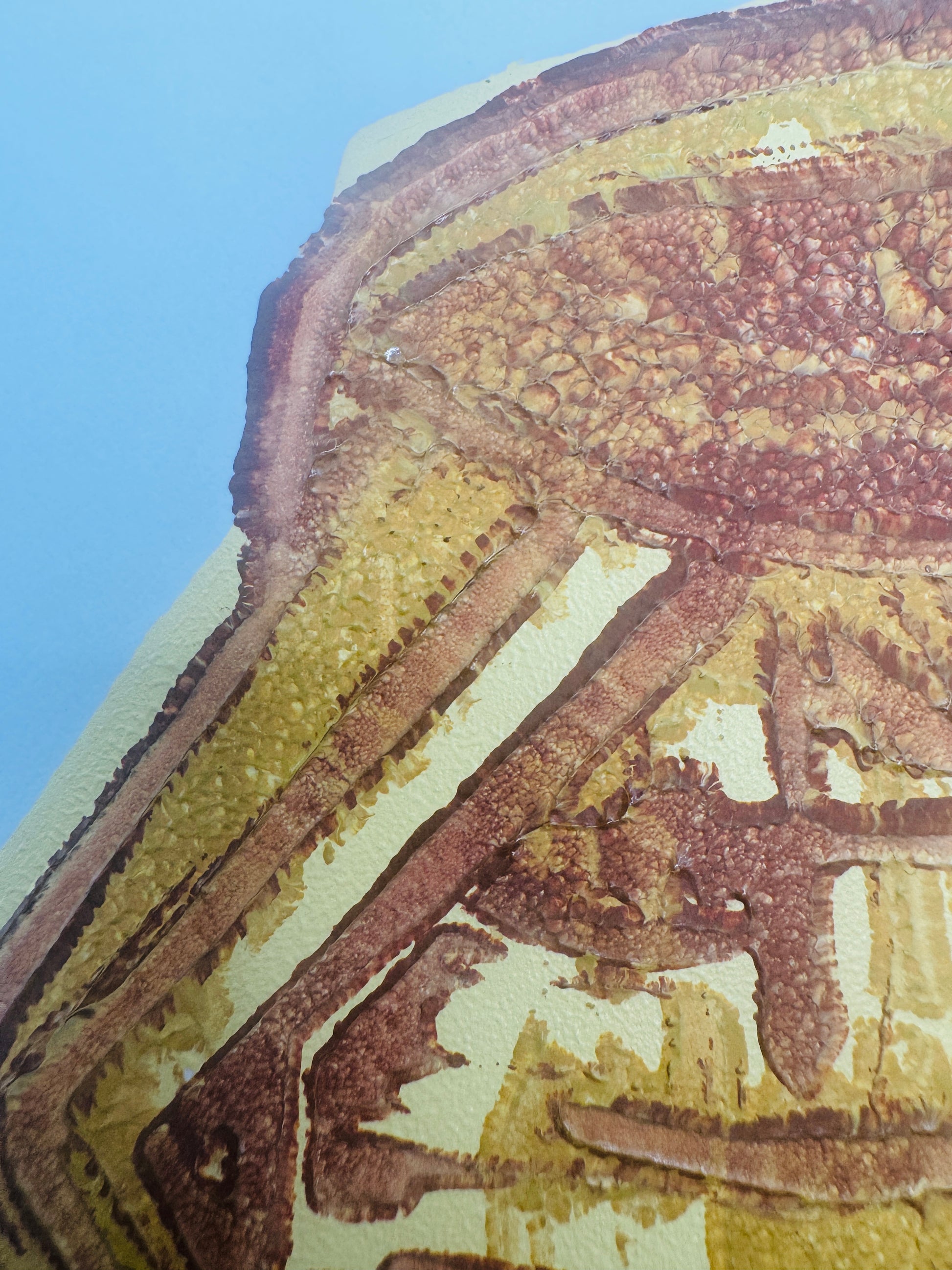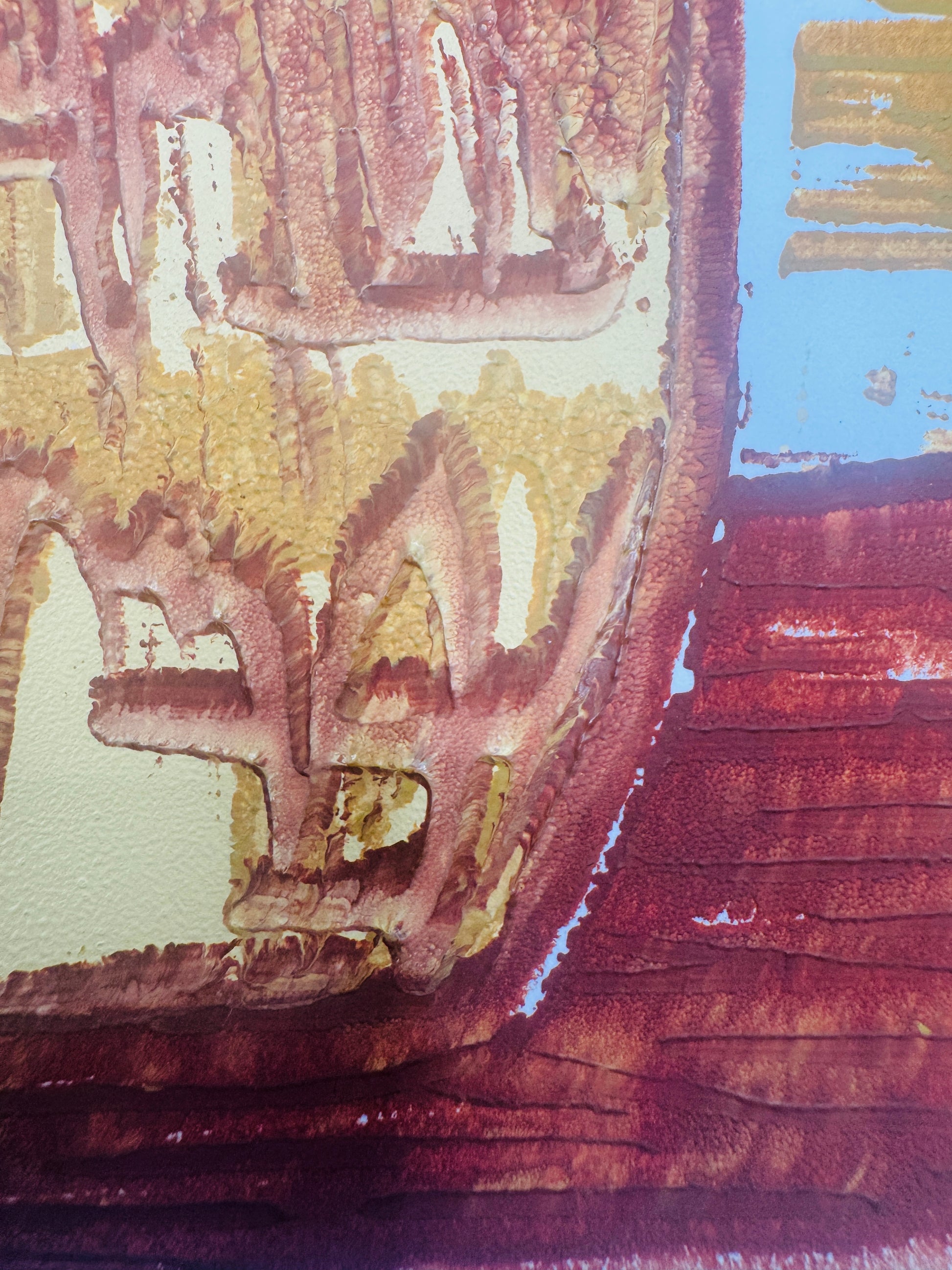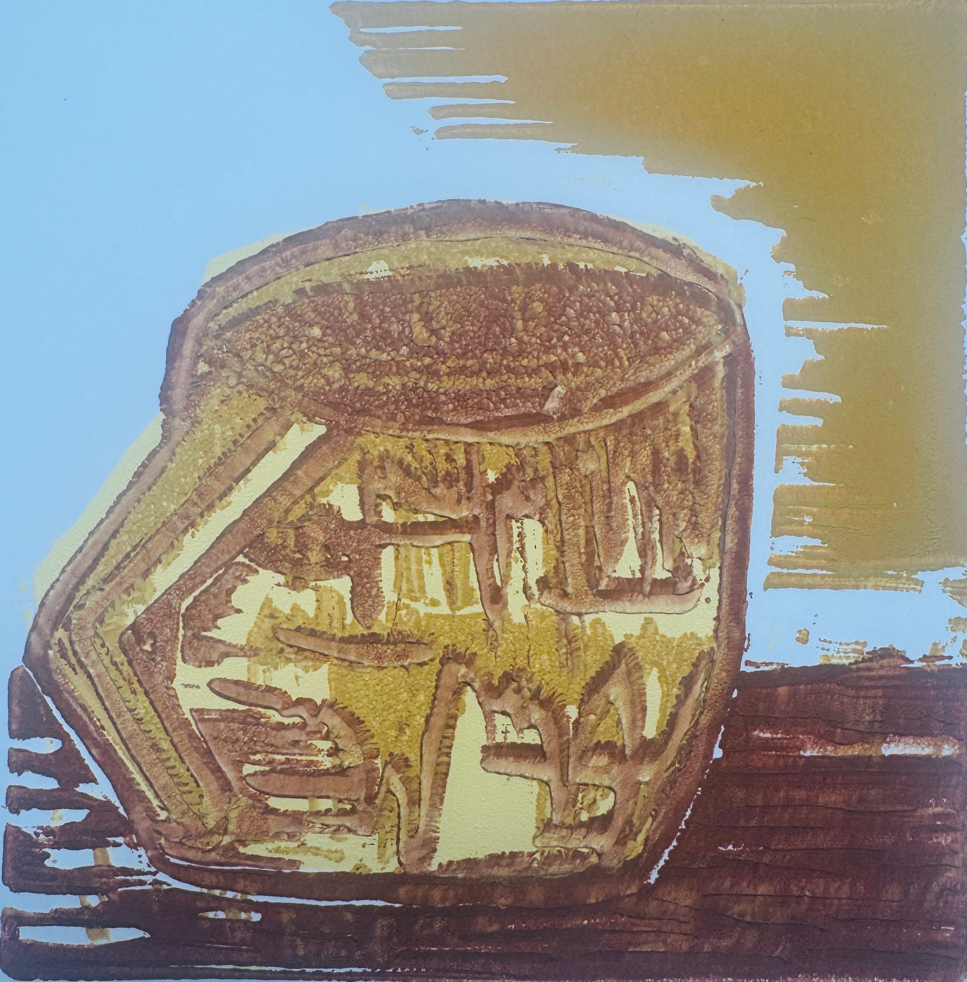 Finally, I carved the shapes of the colors three times in wood blocks and printed all three colors on 100% cotton paper. This piece is 6”x6” with a thick border (total dimensions 9”x8”).