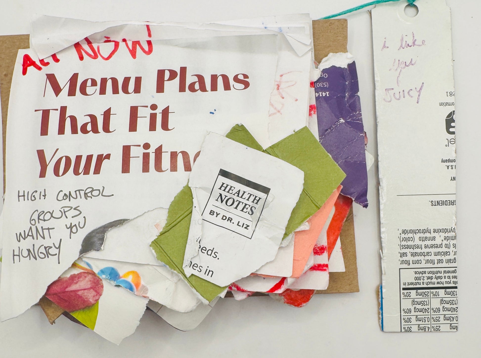 2024. I glued a series of fatphobic messages into this journal and then responded to those thoughts loosely with a variety of pens.