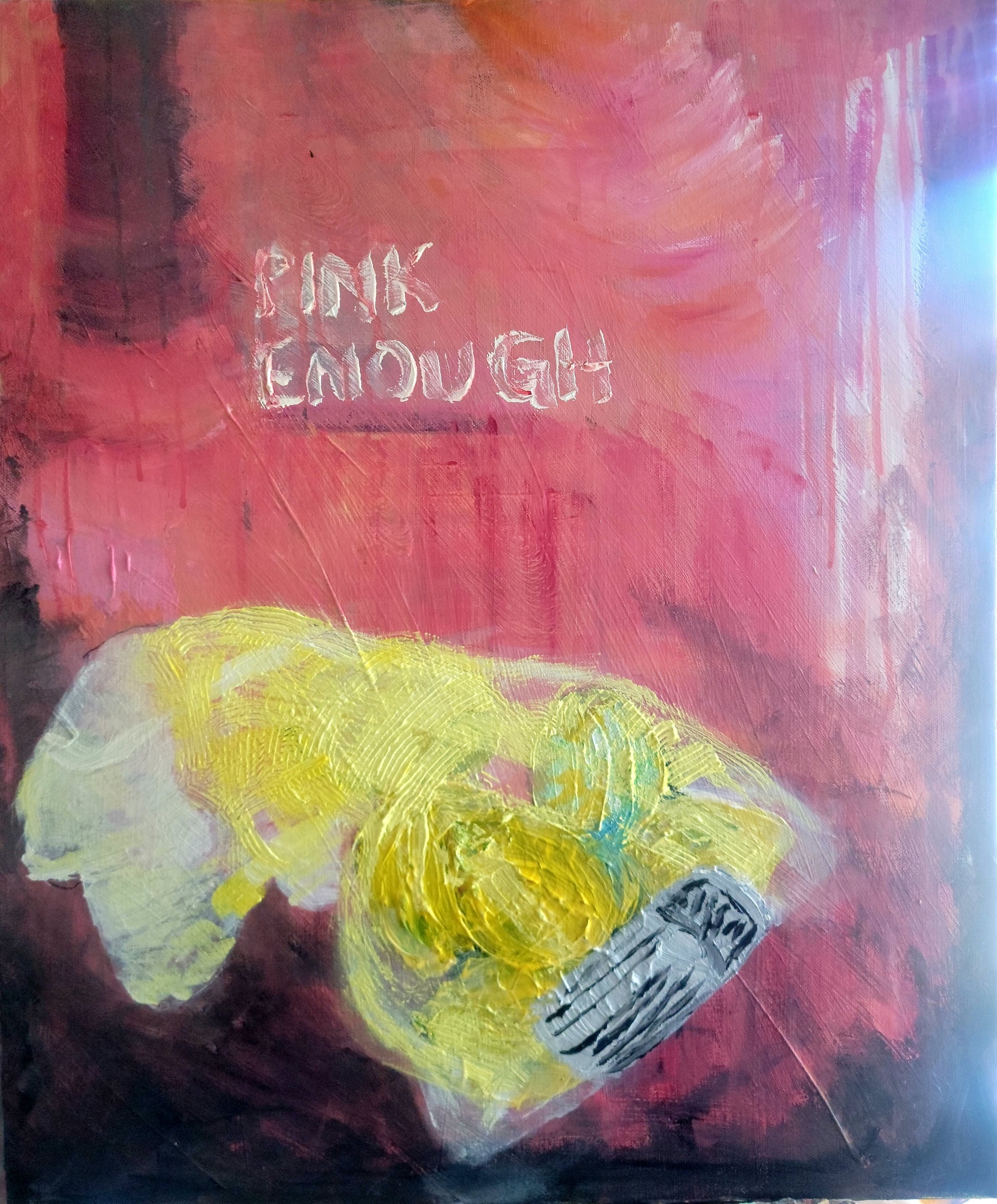 This piece is called Pink Enough, and is made of paints I had available at the time. It features a bag of lemons, because I was getting annoyed at real artists who paint individual lemons on exquisite canvasses with special minerals while the rest of us are scraping by.