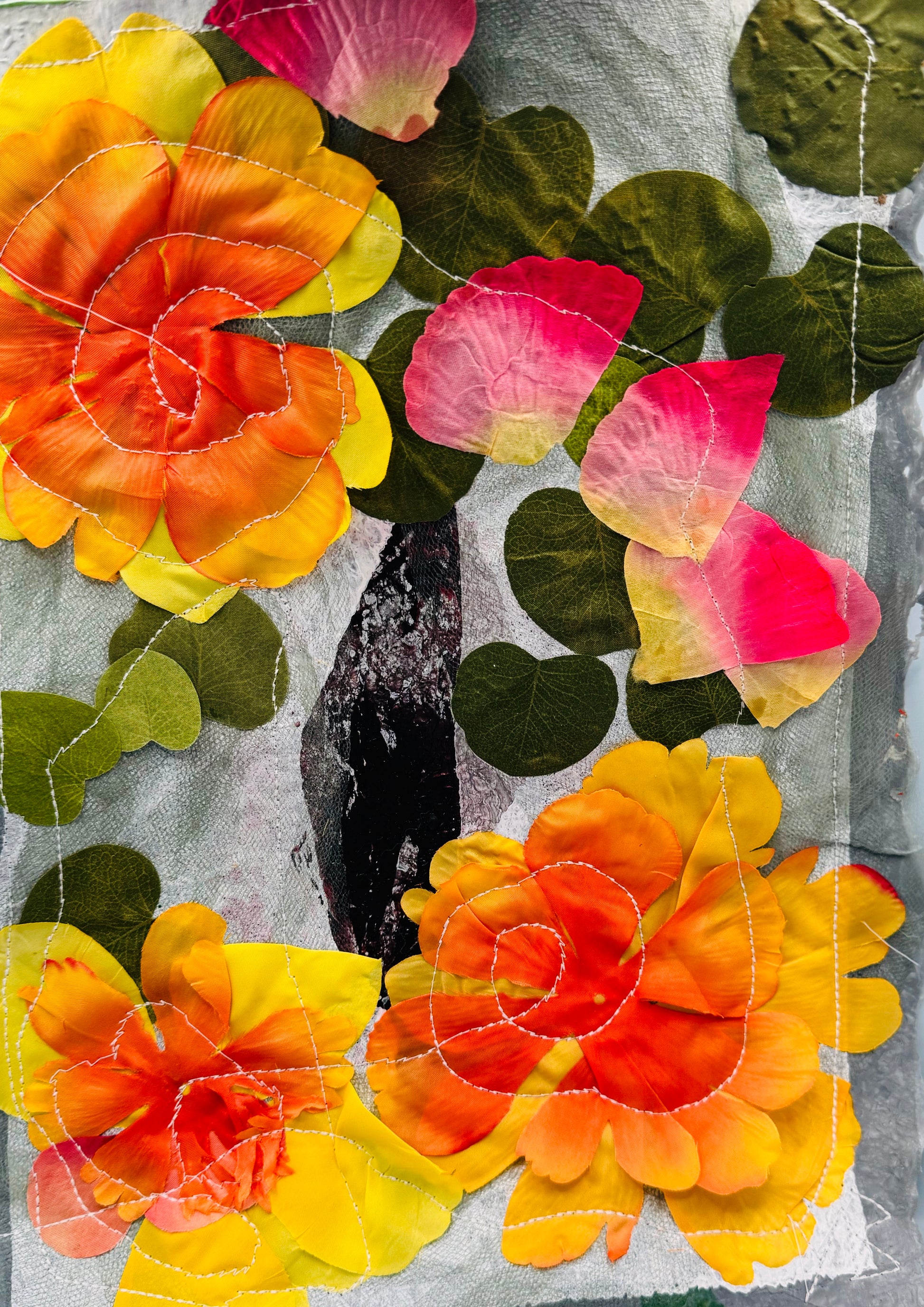 2024. This tapestry was created for wedding celebrants, from pressed plastic reclaimed from the packaging used to transport wedding gifts. The plastic was painted with acrylic paint, allowed to dry, and then pressed again. This created a very thick and firm material. I also attempted to press the silk-plastic flowers into the plastic, which was mildly successful. I then stitched a meditation path through the piece, tightening the hold on the flowers, petals, and leaves.
