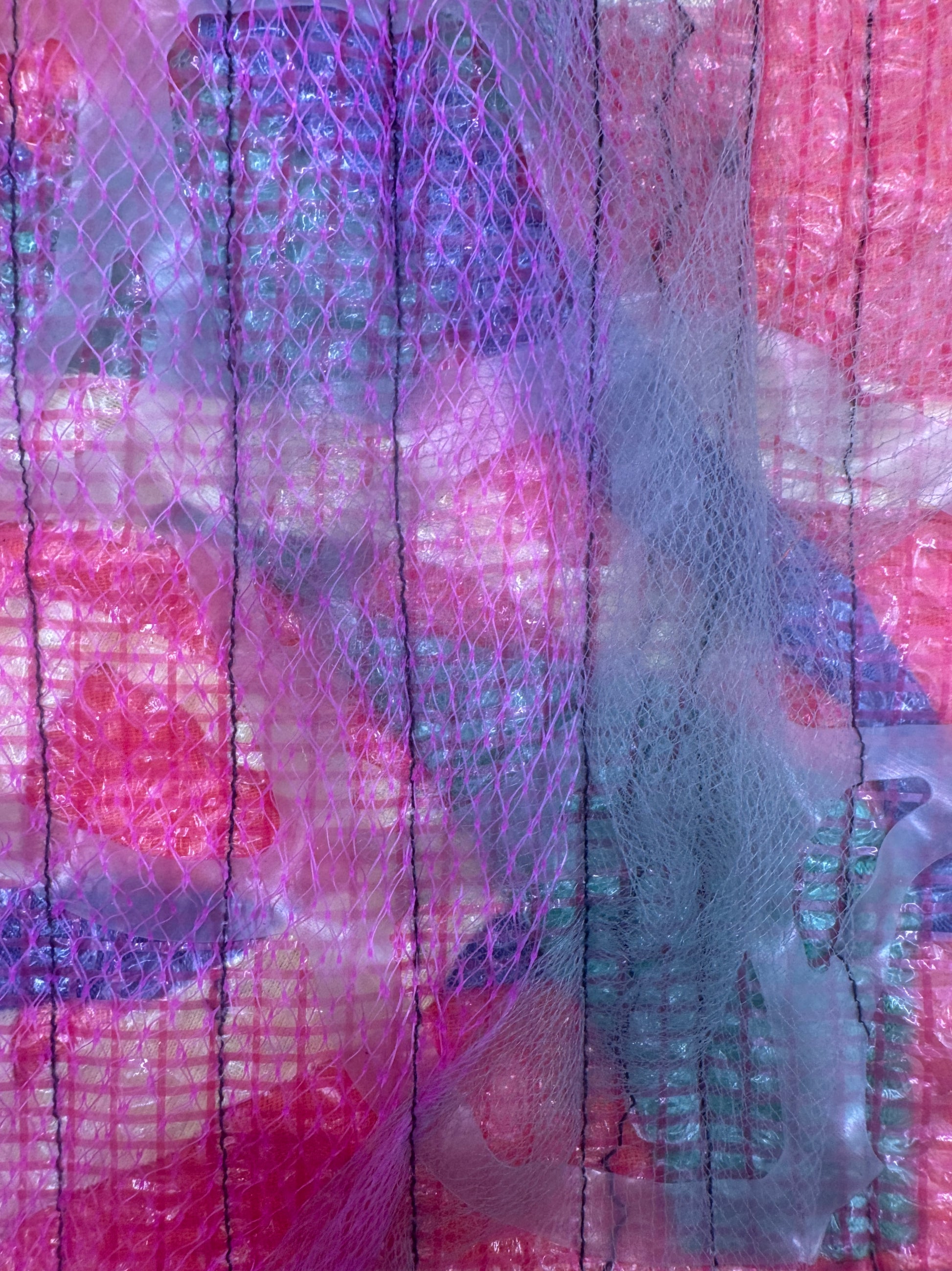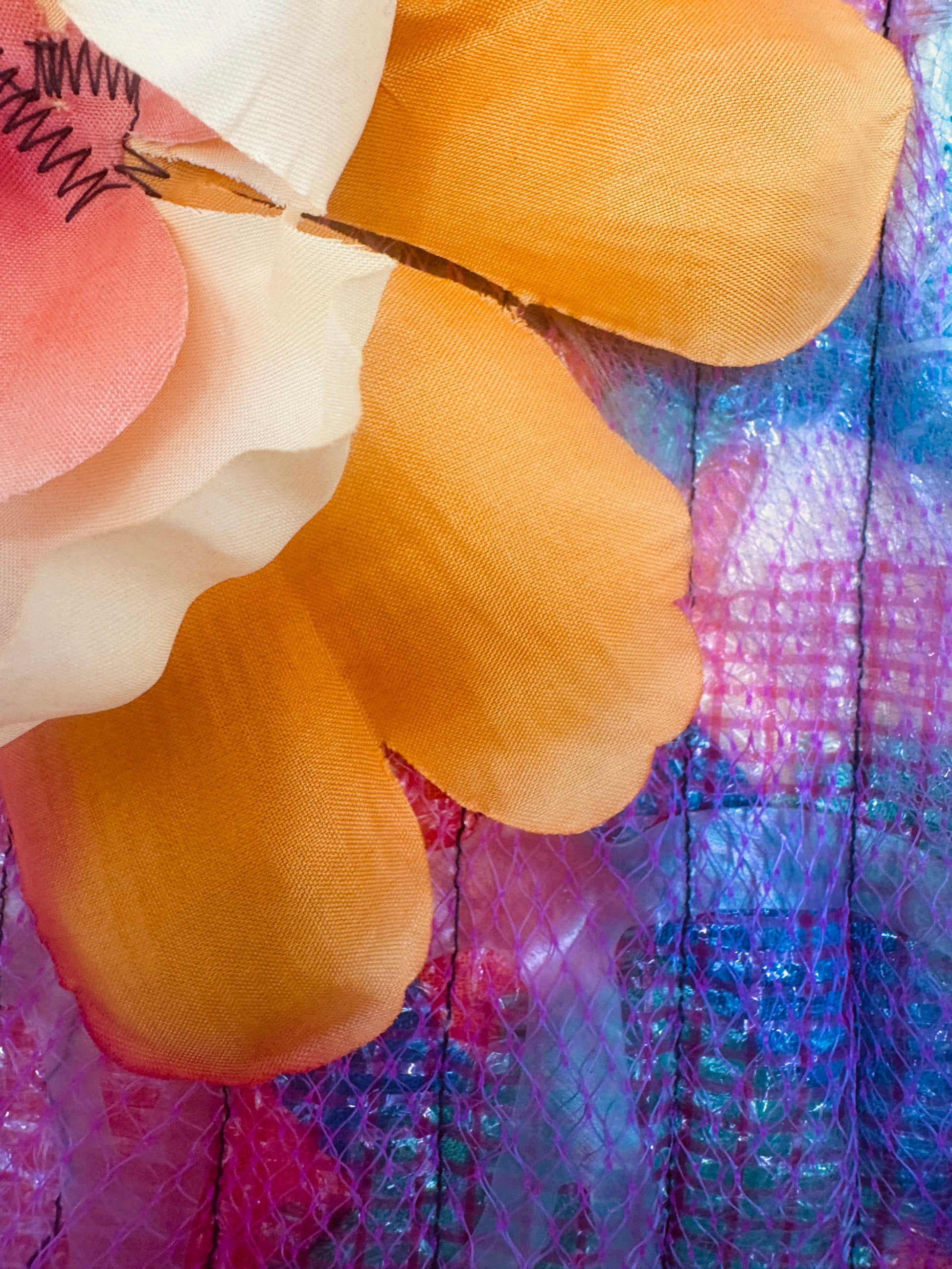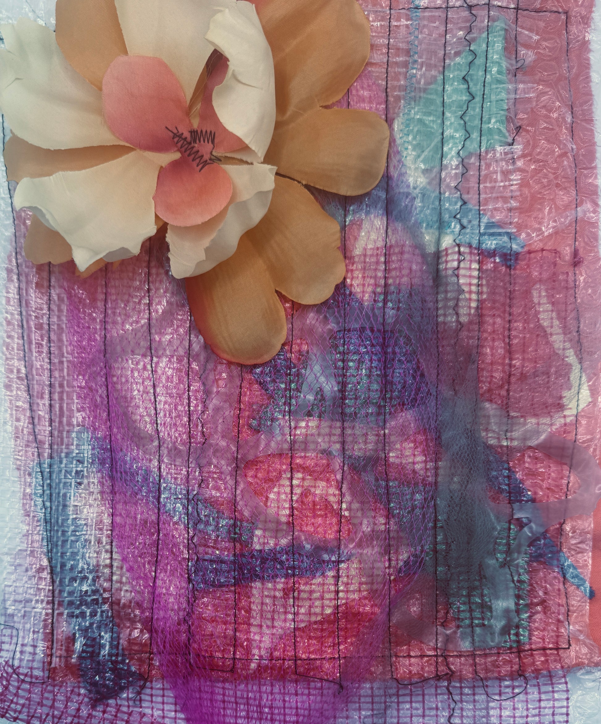2025. 13”x11”. A unique item created from fabric, soda ring plastic, netting, batting, and silk flower sewn together in orderly rows.