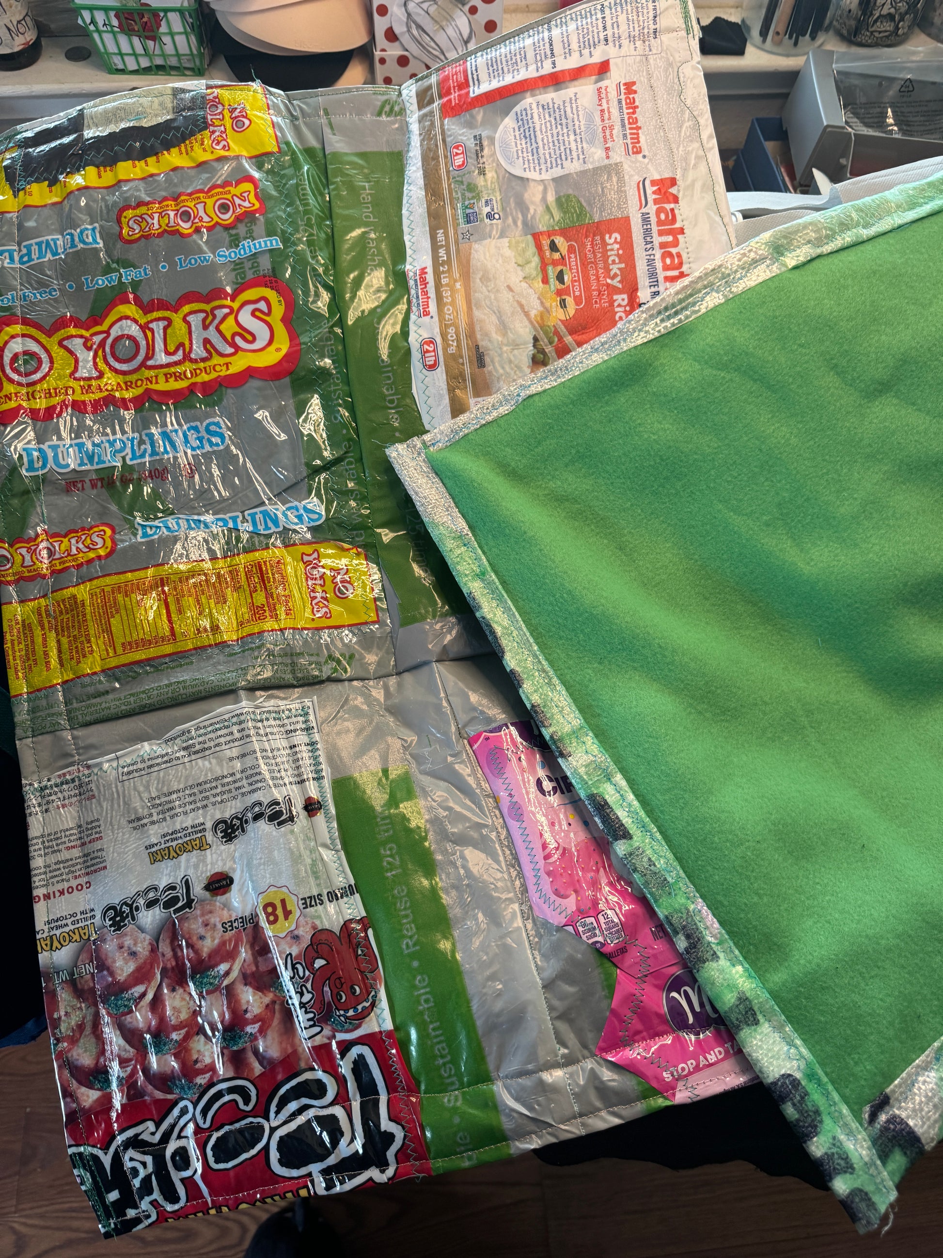Twenty-five sit-upons were created with goat feed bags from gm.goat farm in Grass Valley, CA for an independent, queer Passover camp in Seattle. The bottom of each sheet of plastic was lined with reclaimed microfleece or other soft fabric.