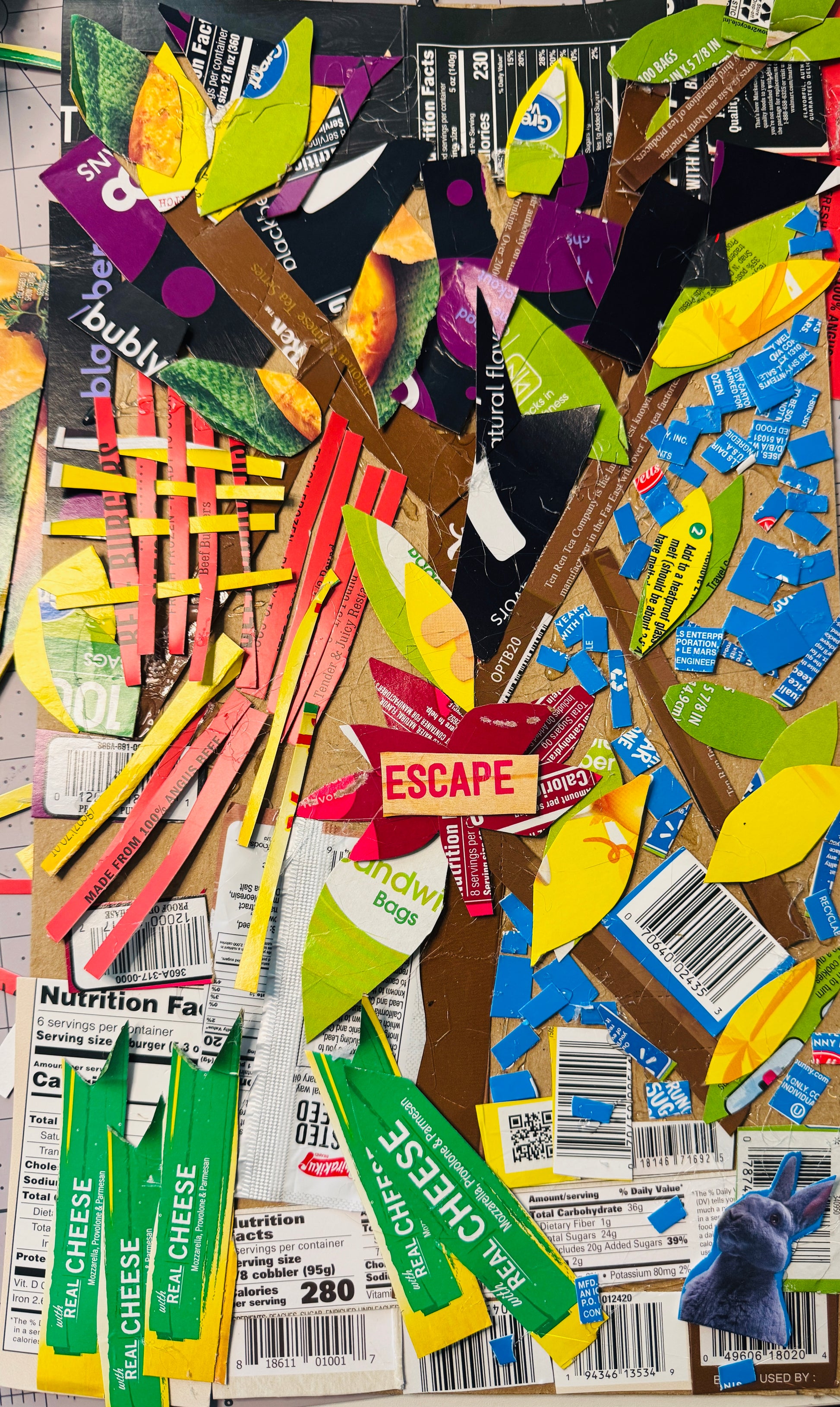 2025. The tree that shelters my ecosystem guided the creation of this collage on cardboard. I used the vibrant colors on freezer boxes to represent nature, and included a layer of barcodes to represent the HOA. There is a little part that's woven, and a message from the heart of the tree advising escape.