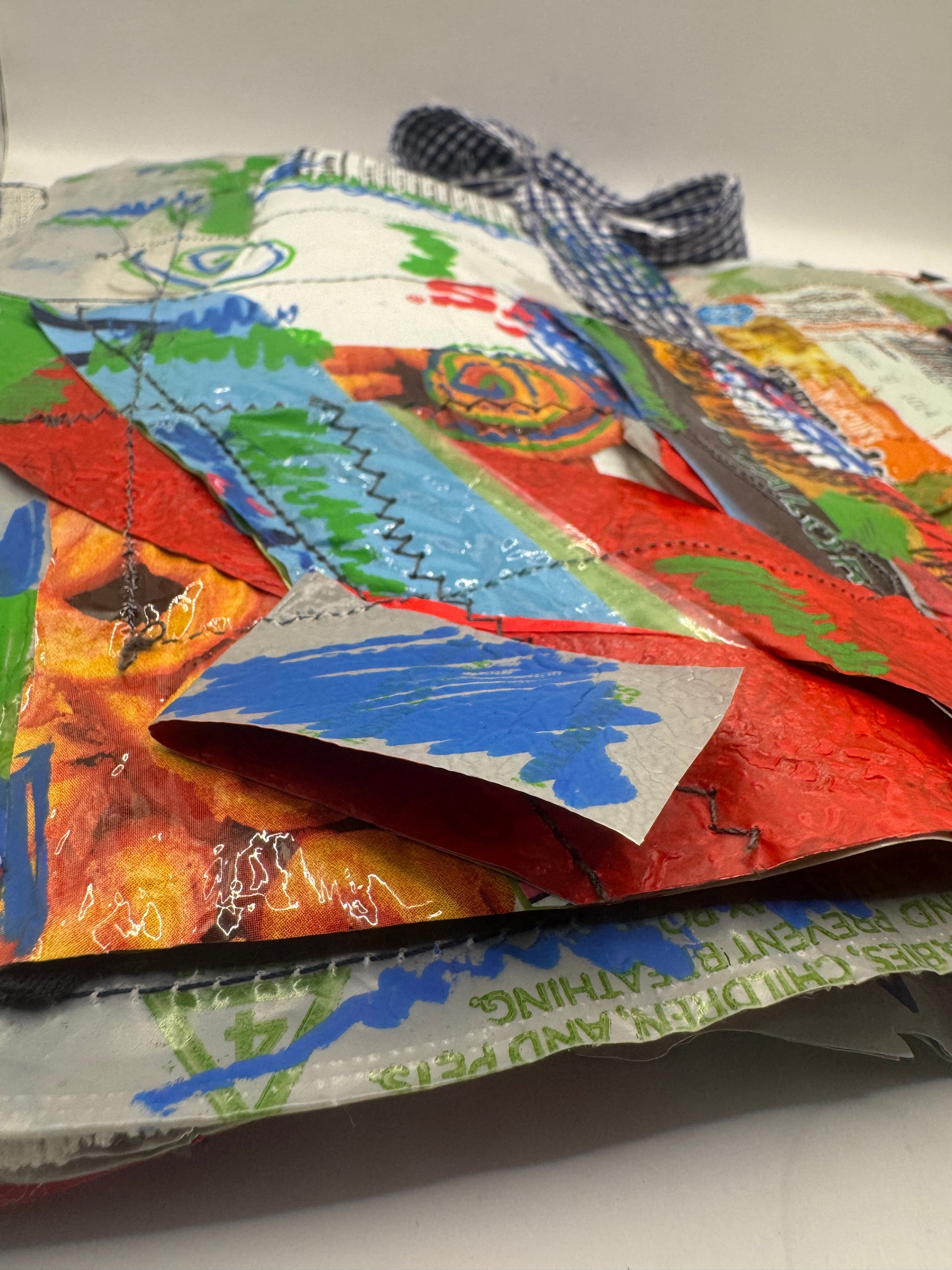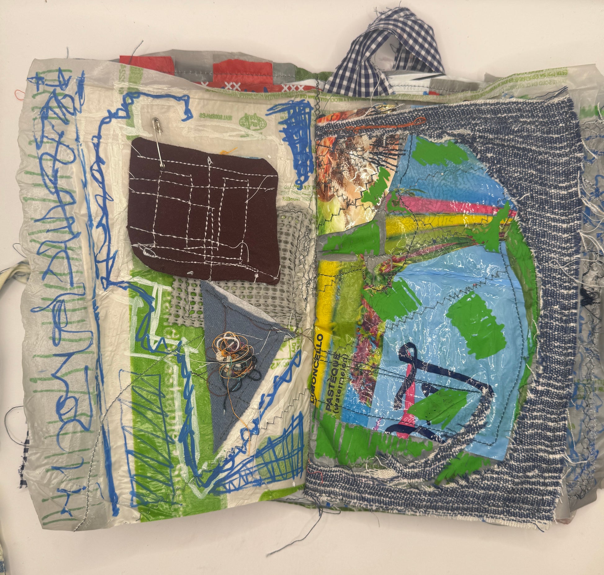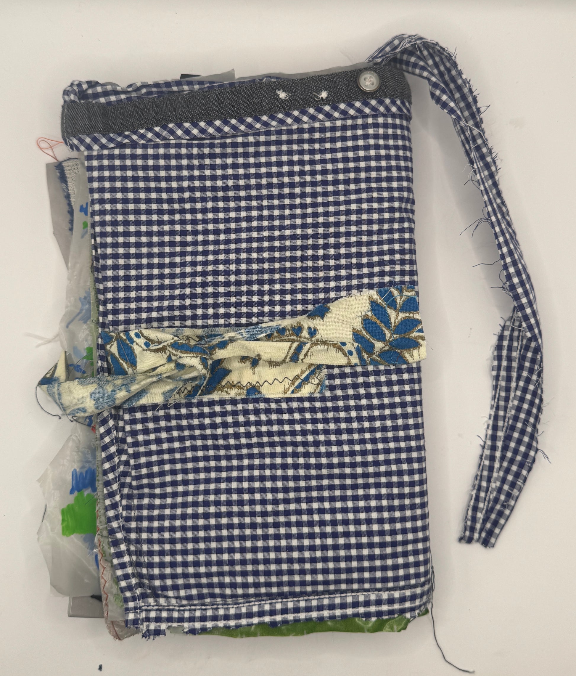 Busy Book 2 was created in the dark by feel alone. Its form follows the material stash in my milk jug basket. It is without the reference points of top and bottom or front and back. Unlike the Book of Flowers or the Book of Squares, story is not told, design is not employed, except that waste can become raw material, texture, color, and form.